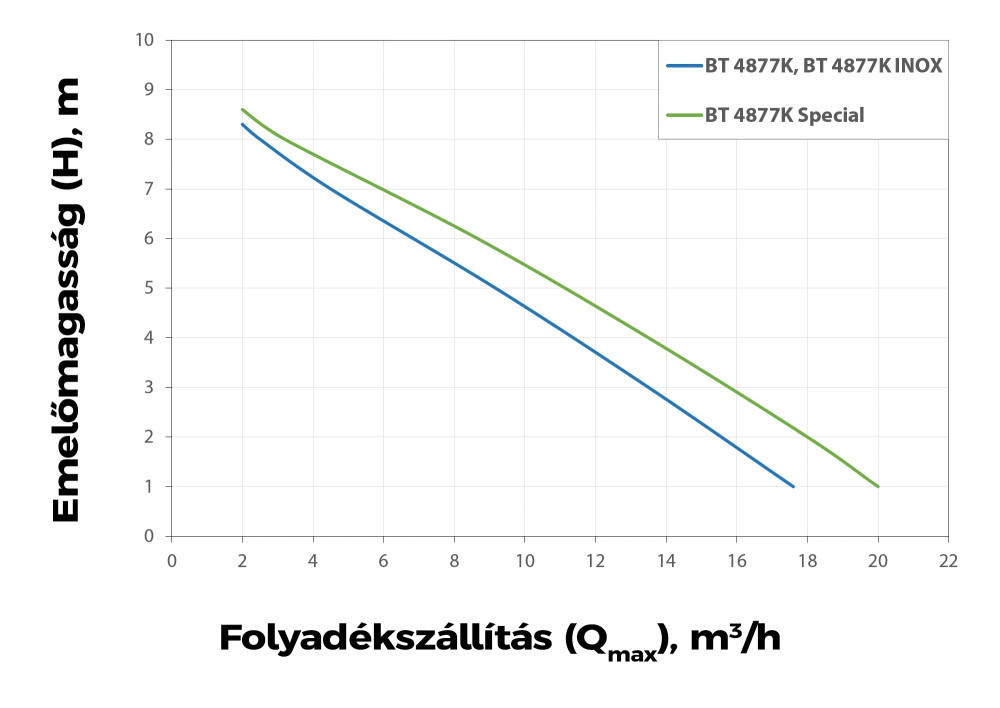 A BT 4877 K Vertical szivattyú 900W teljesítménnyel és 22 m³/h folyadékszállítási kapacitással rendelkezik, így közepes igénybevételű alkalmazásokra is alkalmas. Az IP X8 védelmi fokozat teljes vízálló funkciókat garantál. Az INOX rozsdamentes acél alapanyag és a korszerű tömítéstechnika együttesen biztosítanak hosszú élettartamot még agresszív szennyvíz esetén is. A szivattyú 5 méteres merülési mélységig és 18 méteres emelési magasságig működik hatékonyan. A 10 méteres H07RN-F 3G 1mm² kábel könnyen telepíthető, a 75 dBA-es zajszint pedig viszonylag csendes üzemeltetést eredményez.